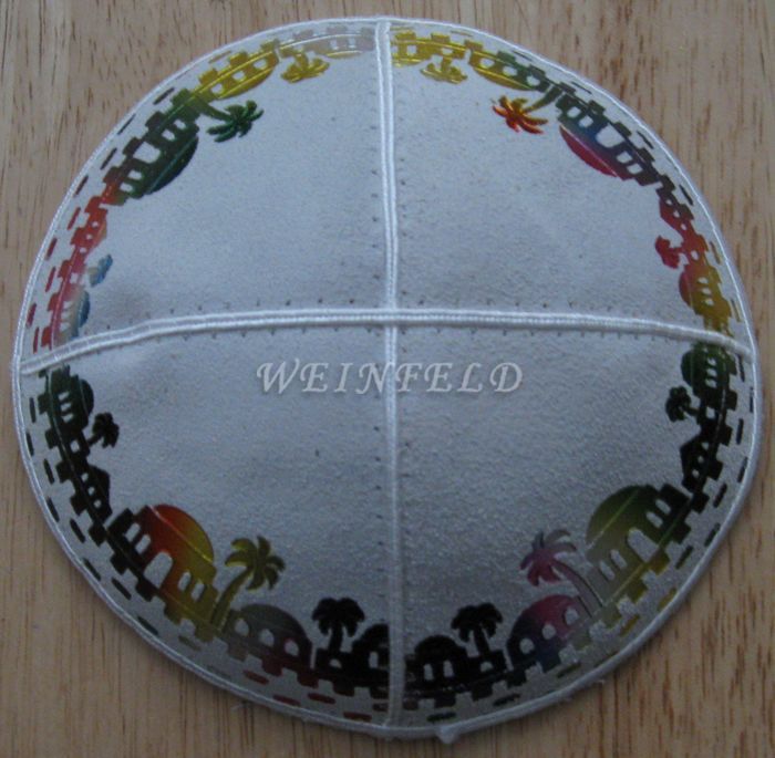Genuine Suede Yarmulkas - WHITE Metallic Embossed - Colored Metalic New Jerusalem on WHITE. All around.