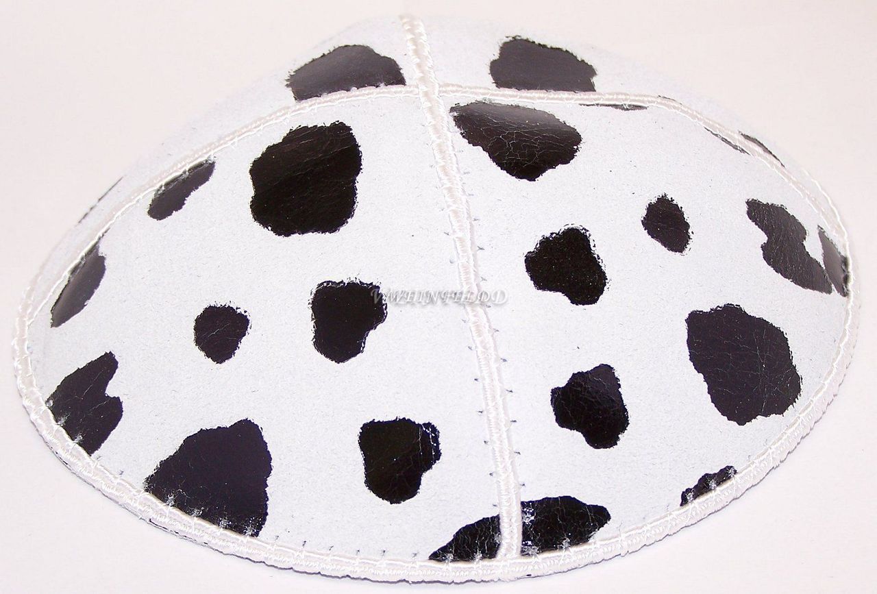 Genuine Suede Yarmulkas - WHITE Metallic Embossed - Cow Pattern in BLACK on WHITE