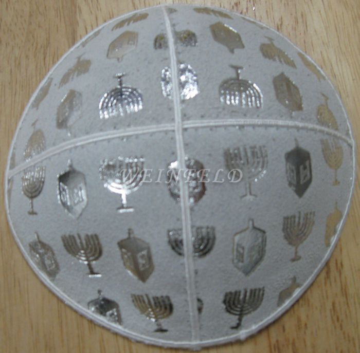 Genuine Suede Yarmulkas - WHITE Metallic Embossed - SILVER Metalic Chanukah on WHITE