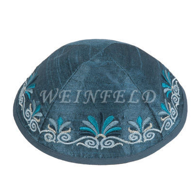 This beautiful blue kippa is embroidered with classic date-palm floral trim.