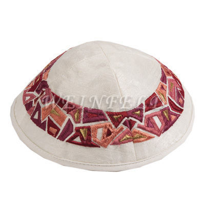 This beautiful cream kippa is embroidered in a crystalline geometric pattern in maroon tones.